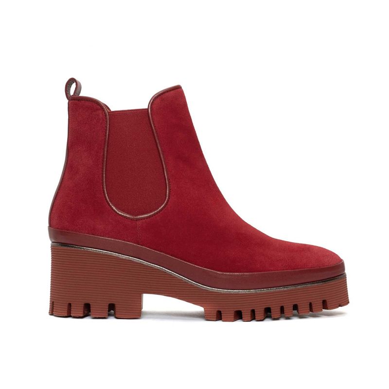 Botín de plataforma Carmen tipo Chelsea realizado en piel velour color rojo. Punta redonda. Elástico lateral con tirador trasero para facilitar el calce. Piso extra ligero de micro a tono. Detalle de cerco realizado en piel a tono y vira de cuero en color acero. Plantilla ortopédica extraíble. Altura trasera 6 cm, altura frontal 2,5 cm.